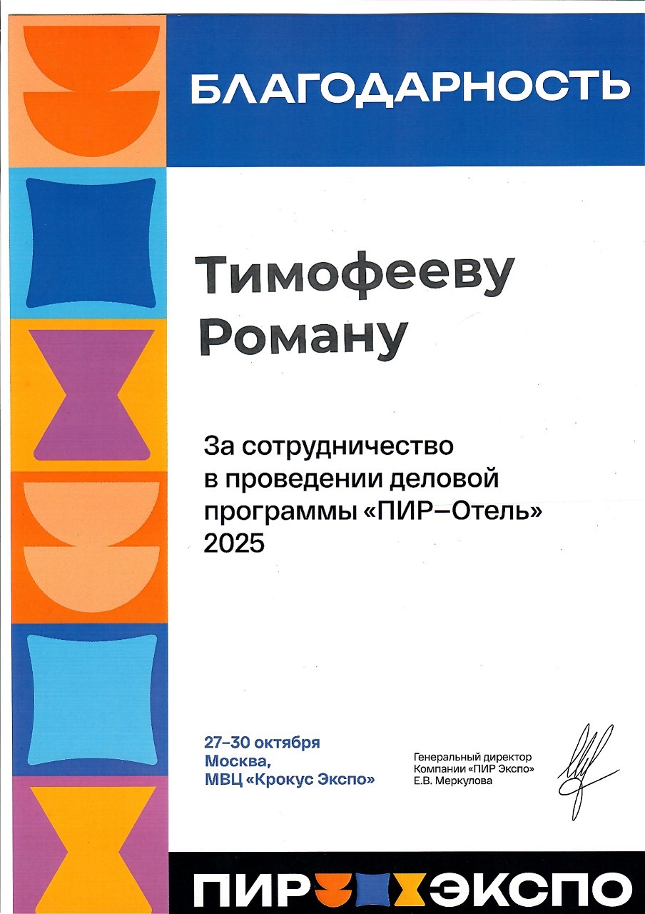 Благодарность CEO ГК Impara Роману Тимофееву от генерального директора "ПИР ЭКСПО"